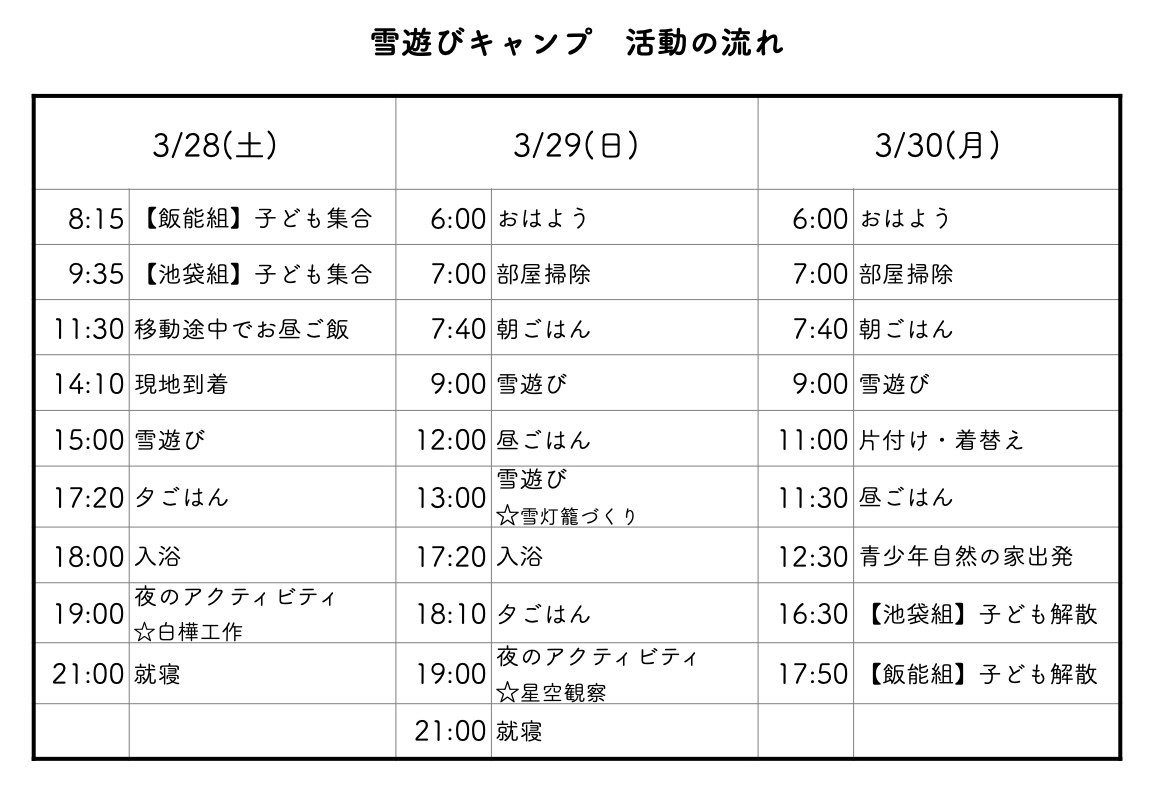 | 持 ち 物 | ◻︎お弁当 (1日目お昼用。使い捨て容器でお願いします。) ◻︎水筒 ◻︎タオル ◻︎3日分の服 ・帽子 ・活動着 ・寝る時の服 ・上着 ・靴下 ◻︎雪遊び道具 ・手袋 ・雨がっぱまたはスキーウェア ・ゴーグル(あれば) (長靴、そりなどは現地で借りられます) ◻︎その他 ・歯ブラシ ・ビニール袋(濡れたウェアを入れる場合があるため大きめのものを) ・常備薬 ・日焼け止め(必要であれば) ☆持ち物には必ず記名を行うようお願いいたします |