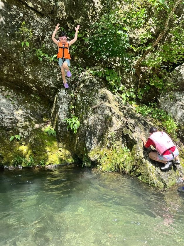岩から飛び込み。怖がる子もいれば、初めてでもへっちゃらな子もいた。