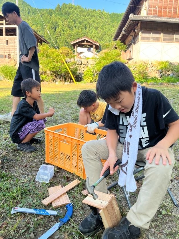 捕まえたヒキガエルの巣箱を作る男の子たち。生き物好き同士で仲良くなっていた。